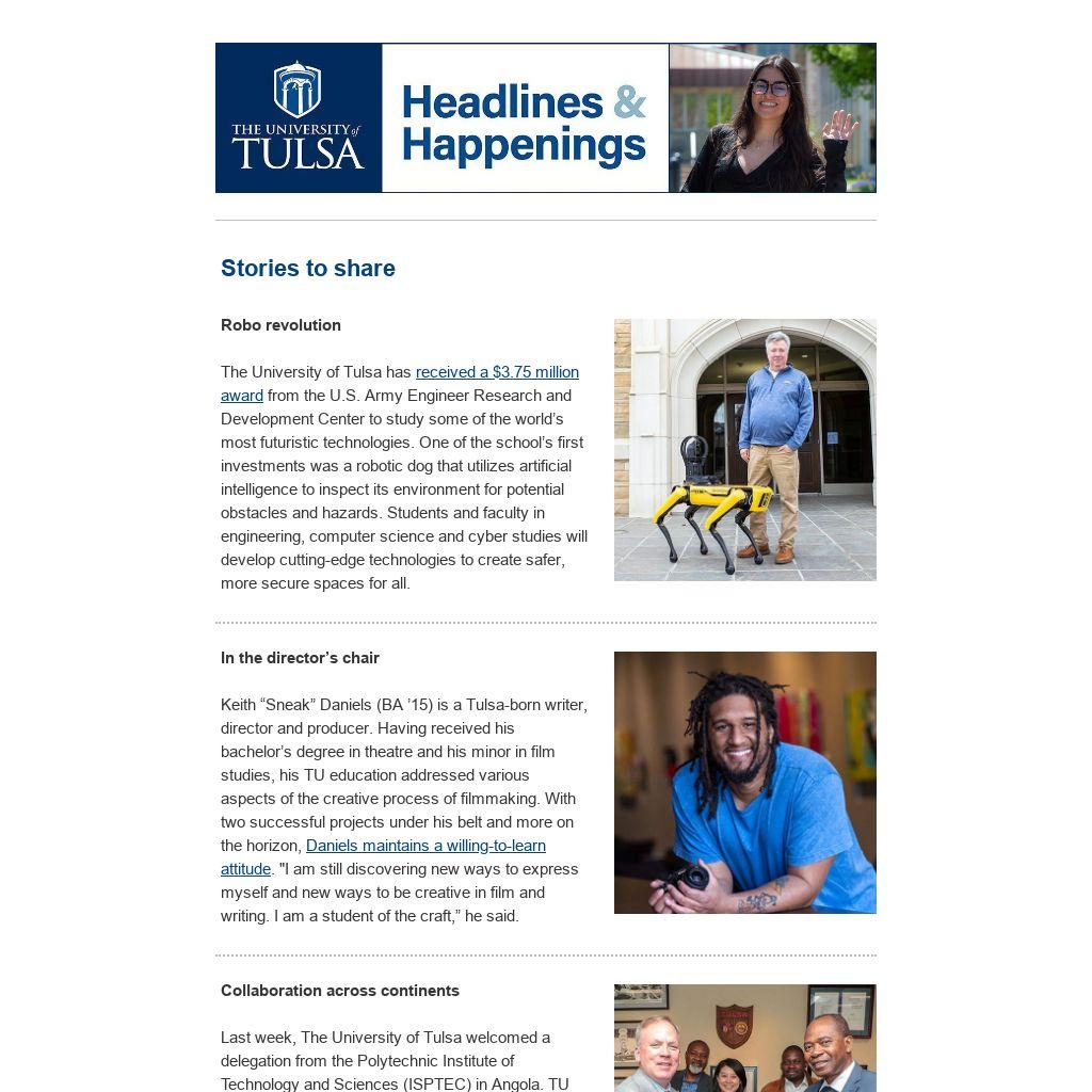 The University of Tulsa has received a $3.75 million award from the U.S. Army Engineer Research and Development Center to study some of the world’s most futuristic technologies. One of the school’s first investments was a robotic dog that utilizes artificial intelligence to inspect its environment for potential obstacles and hazards. Students and faculty in engineering, computer science and cyber studies will develop cutting-edge technologies to create safer, more secure spaces for all.