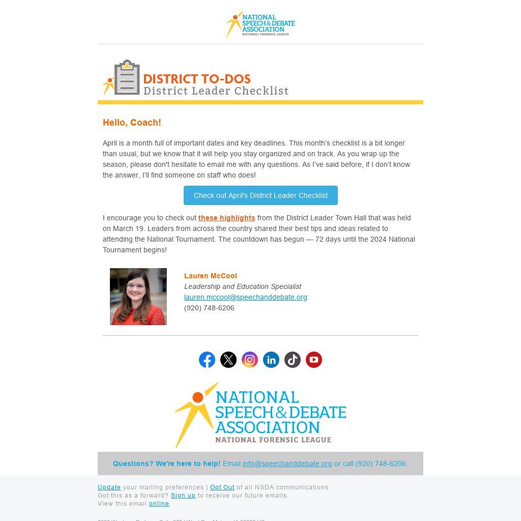 April is a month full of important dates and key deadlines. This month’s checklist is a bit longer than usual, but we know that it will help you stay organized and on track. As you wrap up the season, please don't hesitate to email me with any questions. As I’ve said before, if I don’t know the answer, I’ll find someone on staff who does!