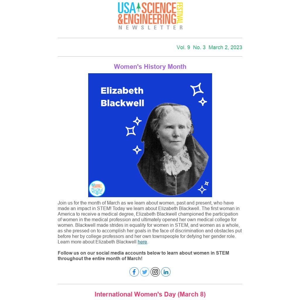 Join us for the month of March as we learn about women, past and present, who have made an impact in STEM! Today we learn about Elizabeth Blackwell. The first woman in America to receive a medical degree, Elizabeth Blackwell championed the participation of women in the medical profession and ultimately opened her own medical college for women. Blackwell made strides in equality for women in STEM, and women as a whole, as she pressed on to accomplish her goals in the face of discrimination and obstacles put before her by college professors and her own townspeople for defying her gender role. Learn more about Elizabeth Blackwell here.