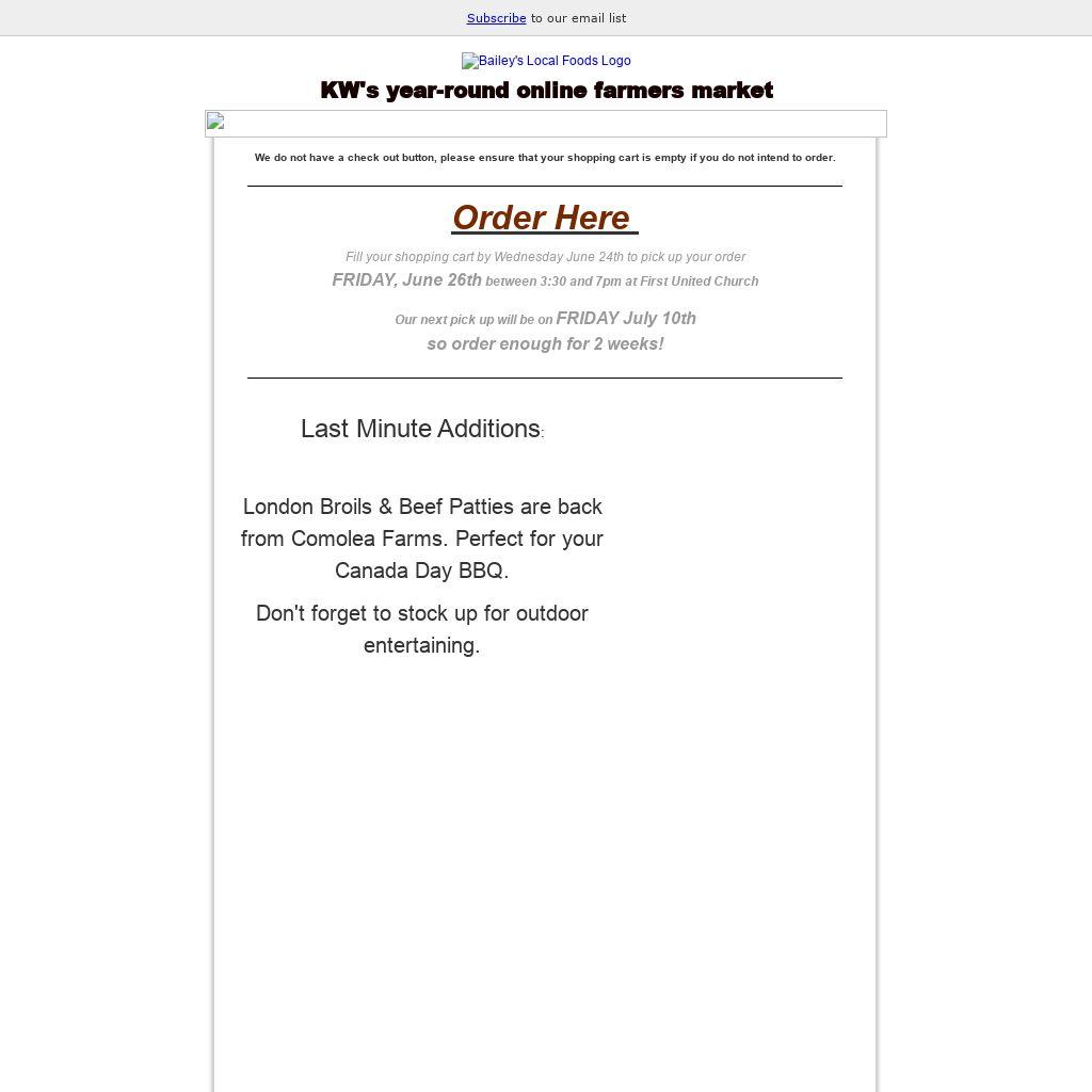 Fill your shopping cart by Wednesday June 24th to pick up your order FRIDAY, June 26th between 3:30 and 7pm at First United Church