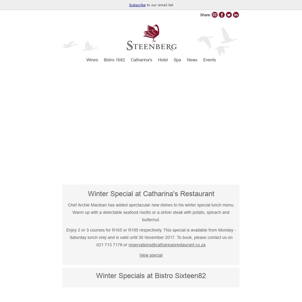 Date: 19 May 2017 | 18:00 for 18:30 | Cost per person: R675 | Catharina's Restaurant