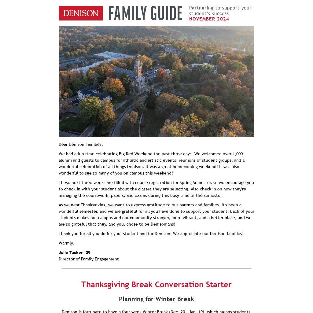 As we near Thanksgiving, we want to express gratitude to our parents and families. It's been a wonderful semester, and we are grateful for all you have done to support your student. Each of your students makes our campus and our community stronger, more vibrant, and a better place, and we are so grateful that they, and you, chose to be Denisonians!