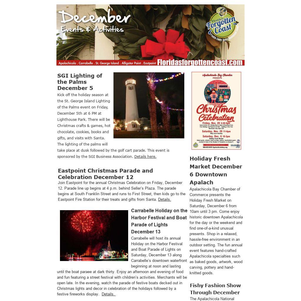 Dec. 2 - Jan. 3 - Anniversary of Pearl Harbor and Christmas During The War Through December 28 - Vintage Bottle Exhibit December 3, 10, 17, 24, 31 - Apalachicola Downtown Market December 4 - SGI Full Moon Climb December 5 - Blues and BBQ at Crooked River Lighthouse December 5 - SGI Lighting of the Palms December 5 - Downtown Carrabelle First Friday December 6 - Holiday Fresh Market, Apalachicola December 6, 20 - Carrabelle Country Farmers' Market December 7 - Bay Area Choral Society Christmas Program December 7, 14, 21, 28 - Endless Bubbles December 1, 8, 15, 22, 29 - Apalach Ghost Tour December 12 - Eastpoint Christmas Parade & Celebration December 13 - Carrabelle Holiday on the Harbor December 13, 27 - Apalachicola Farmers Market December 19 - Apalachicola Downtown Walkabout January 17 - Apalachicola Oyster Cook-off January 22-24 - Butts & Clucks Cookoff