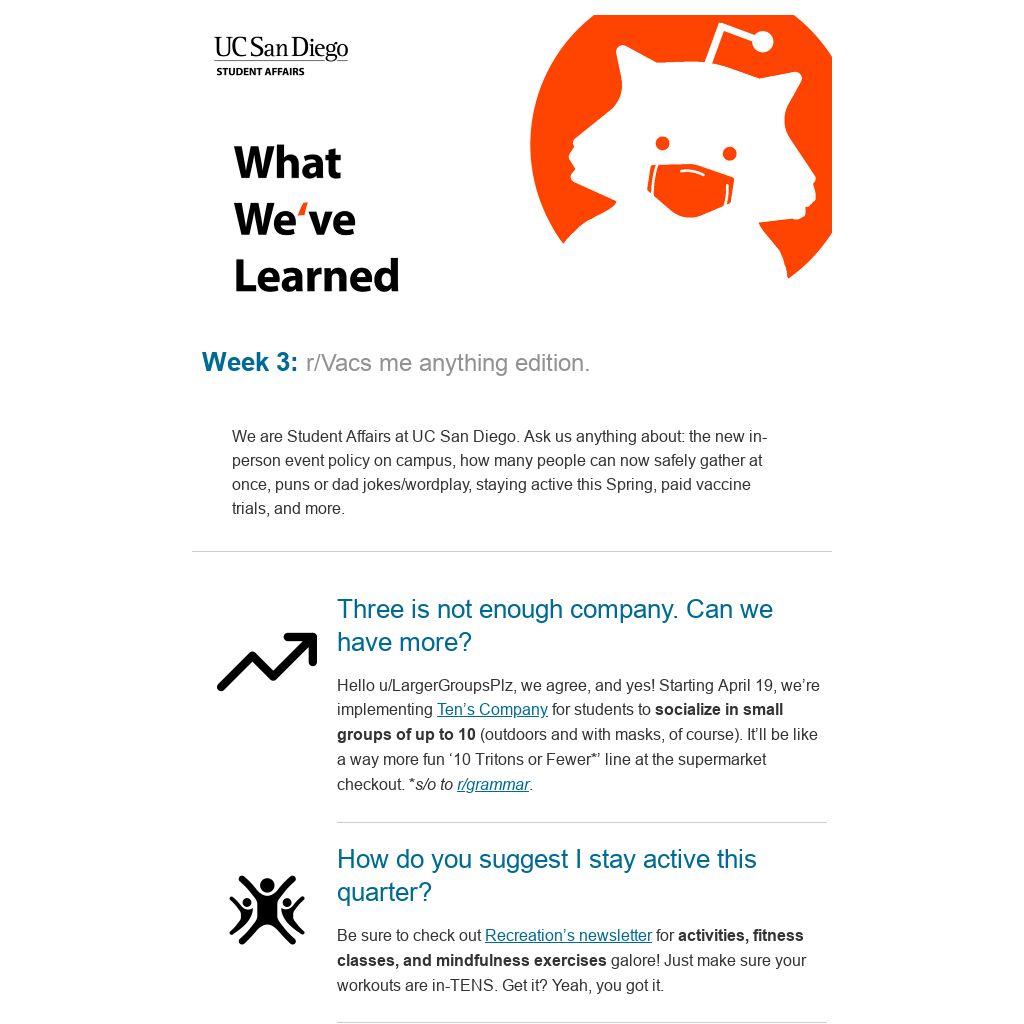 We are Student Affairs at UC San Diego. Ask us anything about: the new in-person event policy on campus, how many people can now safely gather at once, puns or dad jokes/wordplay, staying active this Spring, paid vaccine trials, and more.