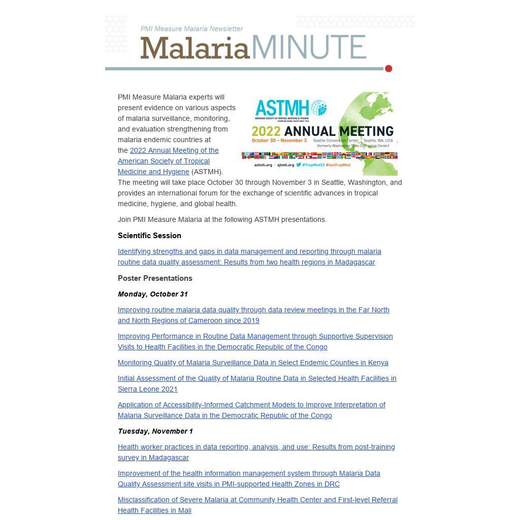 PMI Measure Malaria experts will present evidence on various aspects of malaria surveillance, monitoring, and evaluation strengthening from malaria endemic countries at the 2022 Annual Meeting of the American Society of Tropical Medicine and Hygiene (ASTMH). The meeting will take place October 30 through November 3 in Seattle, Washington, and provides an international forum for the exchange of scientific advances in tropical medicine, hygiene, and global health.