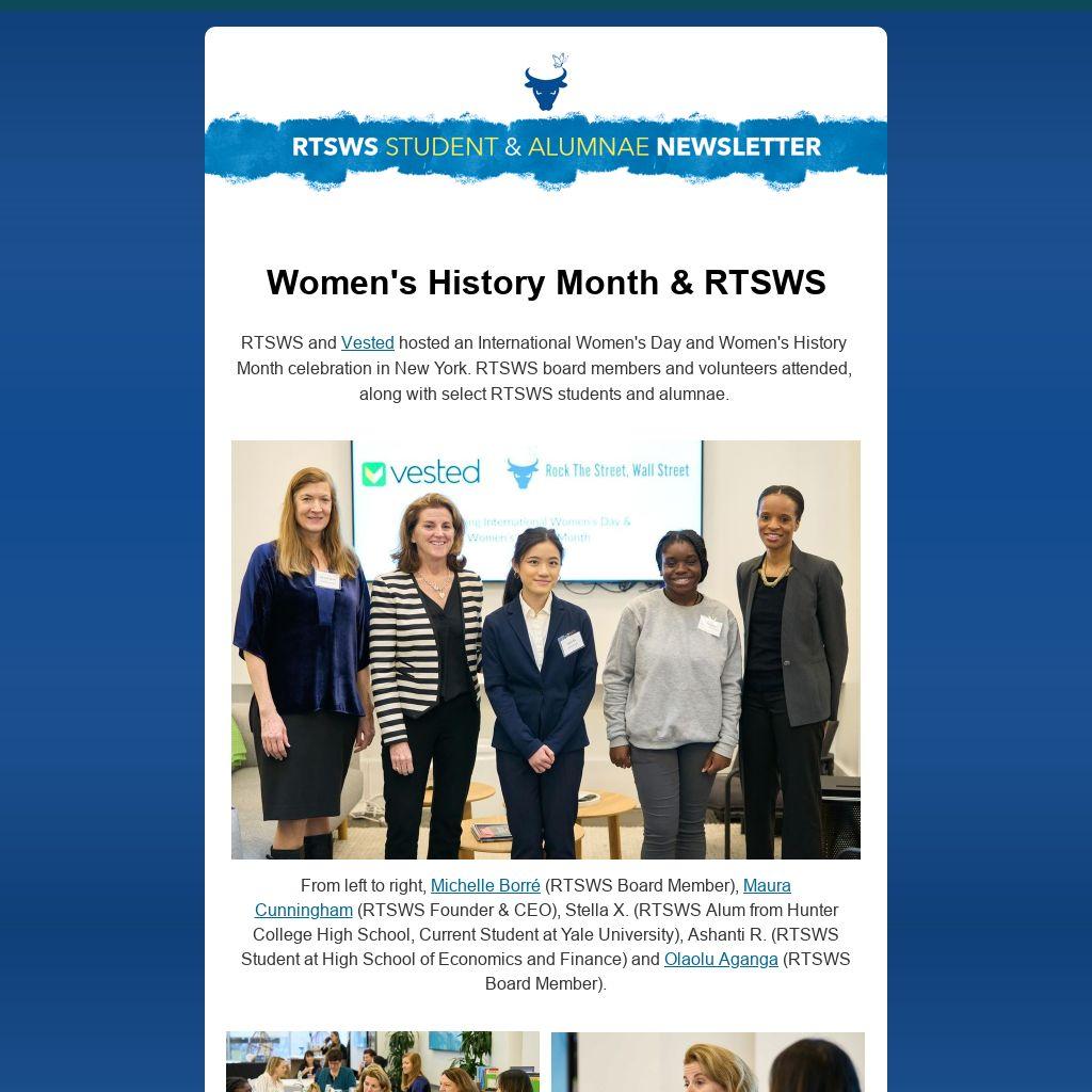 RTSWS and Vested hosted an International Women's Day and Women's History Month celebration in New York. RTSWS board members and volunteers attended, along with select RTSWS students and alumnae.