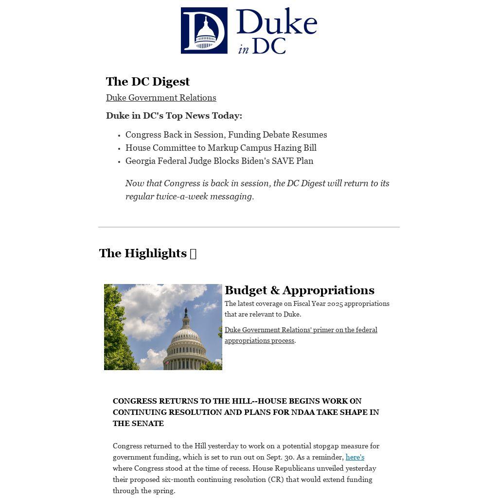 Congress returned to the Hill yesterday to work on a potential stopgap measure for government funding, which is set to run out on Sept. 30. As a reminder, here's where Congress stood at the time of recess. House Republicans unveiled yesterday their proposed six-month continuing resolution (CR) that would extend funding through the spring.