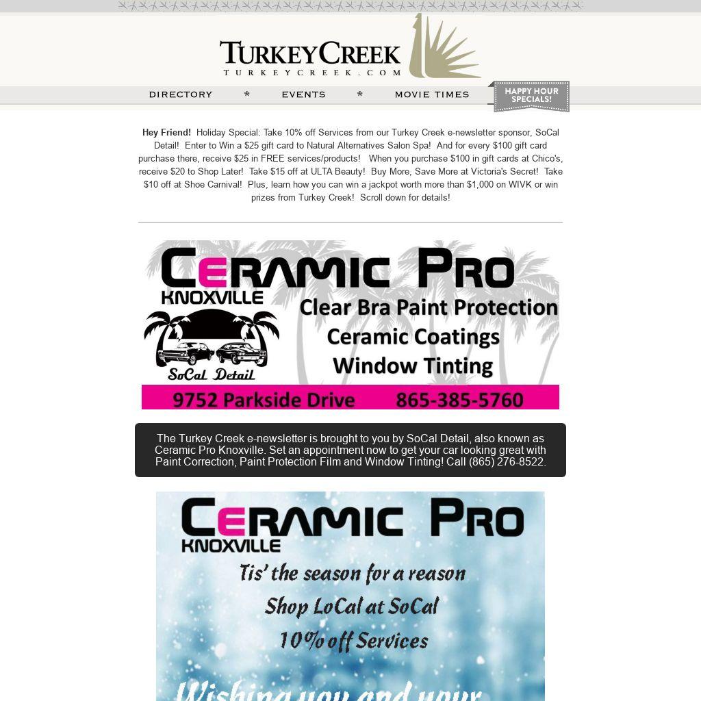 Hey Friend! Holiday Special: Take 10% off Services from our Turkey Creek e-newsletter sponsor, SoCal Detail! Enter to Win a $25 gift card to Natural Alternatives Salon Spa! And for every $100 gift card purchase there, receive $25 in FREE services/products! When you purchase $100 in gift cards at Chico's, receive $20 to Shop Later! Take $15 off at ULTA Beauty! Buy More, Save More at Victoria's Secret! Take $10 off at Shoe Carnival! Plus, learn how you can win a jackpot worth more than $1,000 on WIVK or win prizes from Turkey Creek! Scroll down for details!