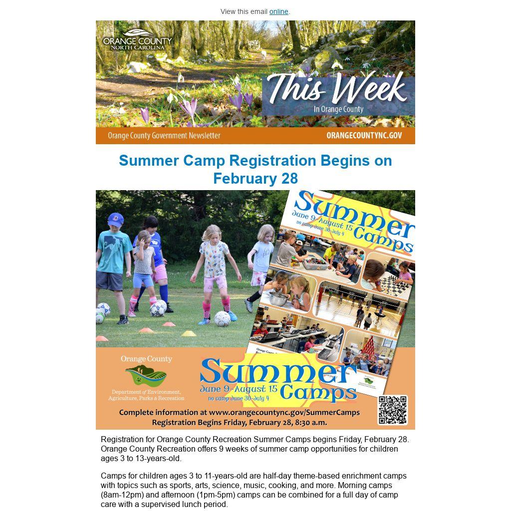 Registration for Orange County Recreation Summer Camps begins Friday, February 28. Orange County Recreation offers 9 weeks of summer camp opportunities for children ages 3 to 13-years-old.