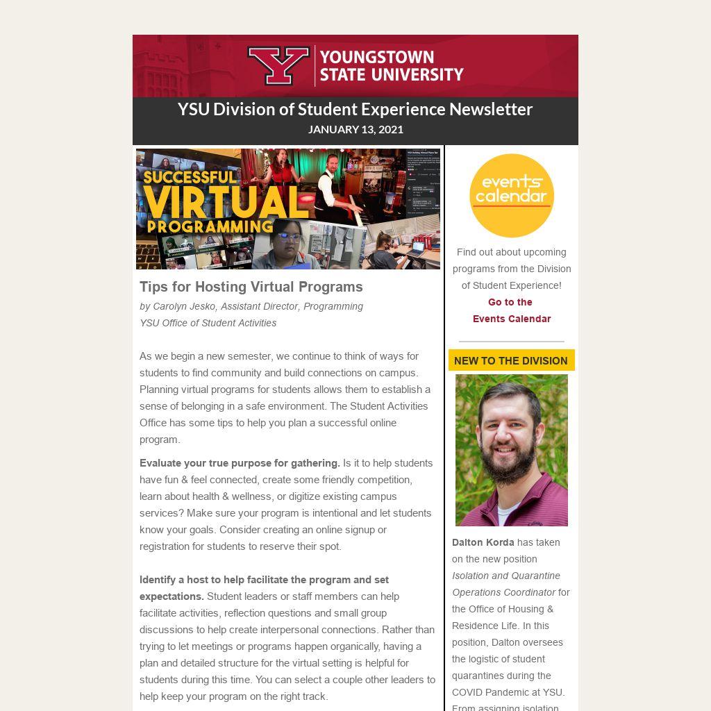 As we begin a new semester, we continue to think of ways for students to find community and build connections on campus. Planning virtual programs for students allows them to establish a sense of belonging in a safe environment. The Student Activities Office has some tips to help you plan a successful online program.