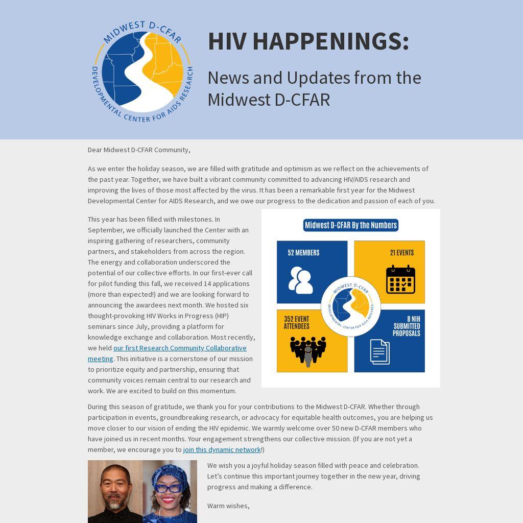 As we enter the holiday season, we are filled with gratitude and optimism as we reflect on the achievements of the past year. Together, we have built a vibrant community committed to advancing HIV/AIDS research and improving the lives of those most affected by the virus. It has been a remarkable first year for the Midwest Developmental Center for AIDS Research, and we owe our progress to the dedication and passion of each of you.
