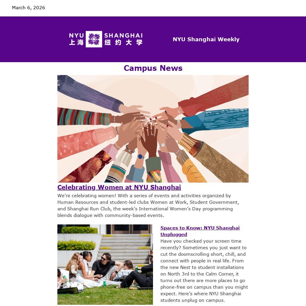 For a complete listing of events at NYU Shanghai, check out the Weekly Events Newsletter, delivered to your inbox every Monday when school is in session. If you wish to highlight your event in the Weekly Events Newsletter, upload your event to EngageĀ no later than the Thursday before the Monday newsletter.