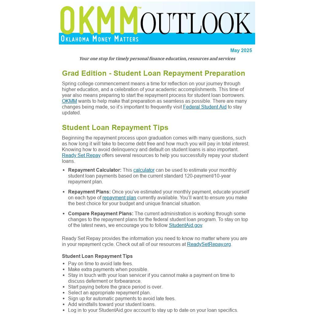Spring college commencement means a time for reflection on your journey through higher education, and a celebration of your academic accomplishments. This time of year also means preparing to start the repayment process for student loan borrowers. OKMM wants to help make that preparation as seamless as possible. There are many changes being made, so it’s important to frequently visit Federal Student Aid to stay updated.