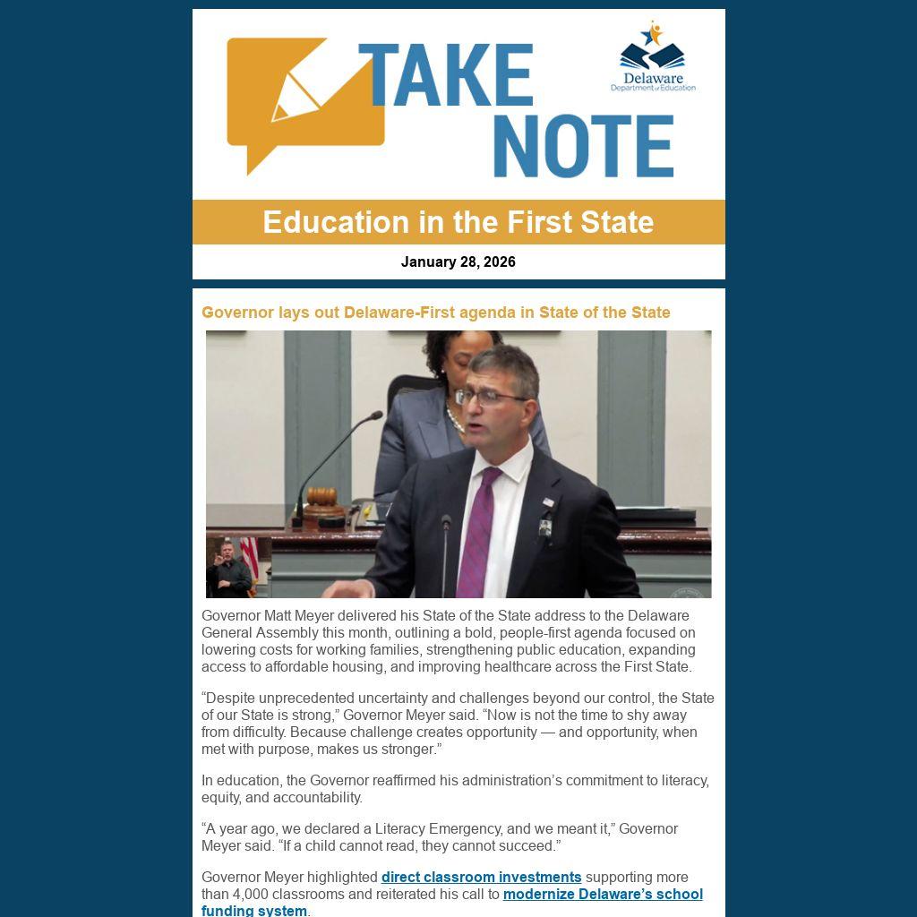 Governor Meyer highlighted direct classroom investments supporting more than 4,000 classrooms and reiterated his call to modernize Delaware’s school funding system.