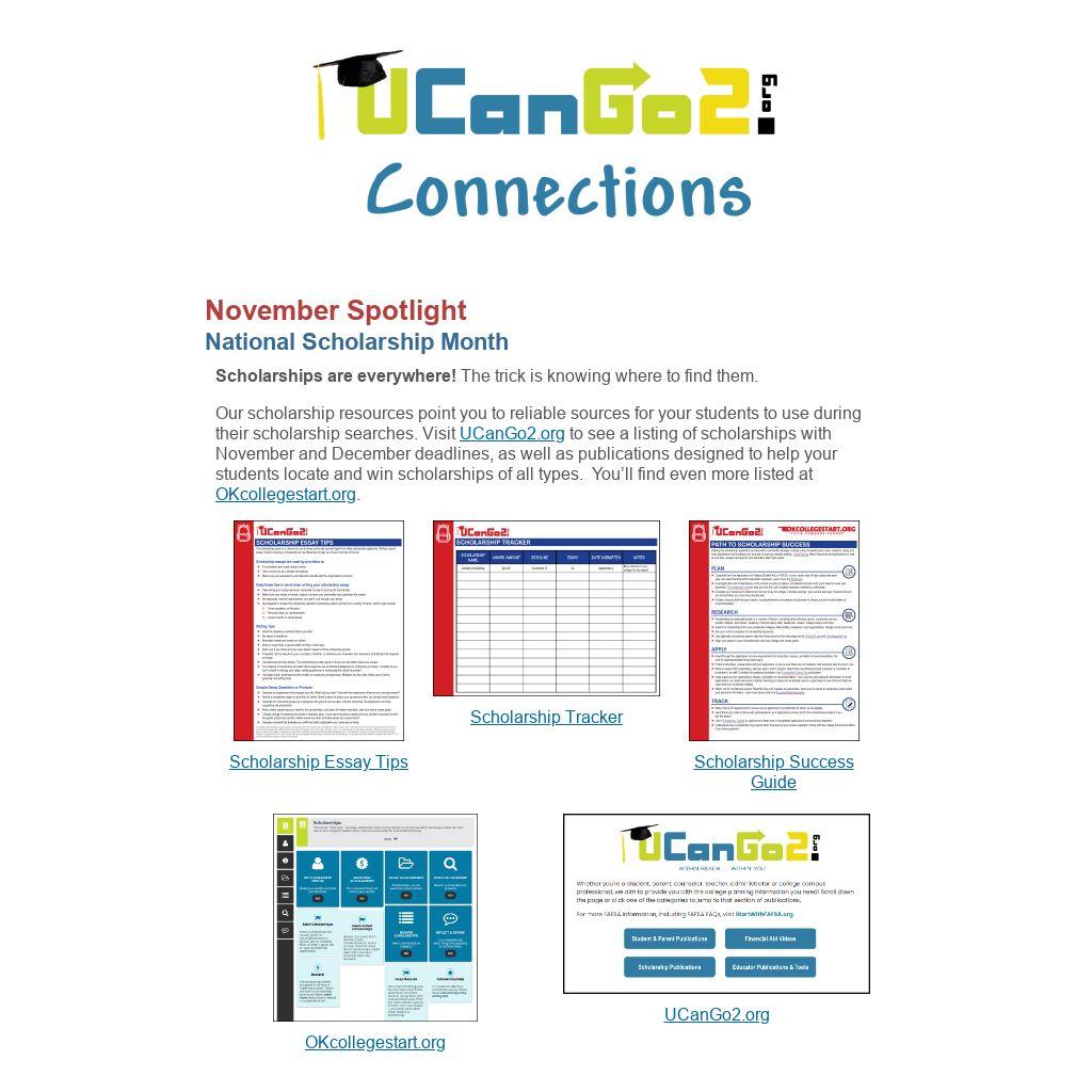 Our scholarship resources point you to reliable sources for your students to use during their scholarship searches. Visit UCanGo2.org to see a listing of scholarships with November and December deadlines, as well as publications designed to help your students locate and win scholarships of all types. You’ll find even more listed at OKcollegestart.org.