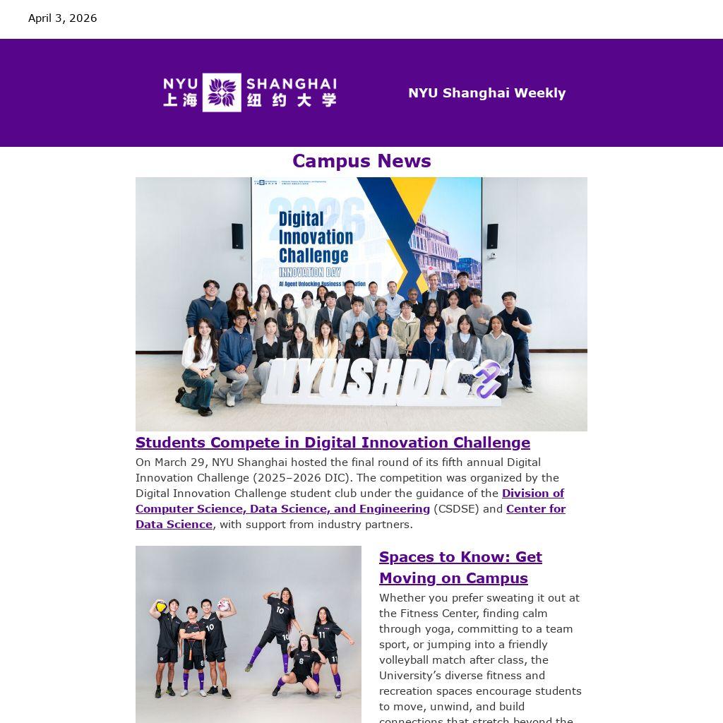 For a complete listing of events at NYU Shanghai, check out the Weekly Events Newsletter, delivered to your inbox every Monday when school is in session. If you wish to highlight your event in the Weekly Events Newsletter, upload your event to Engage no later than the Thursday before the Monday newsletter.