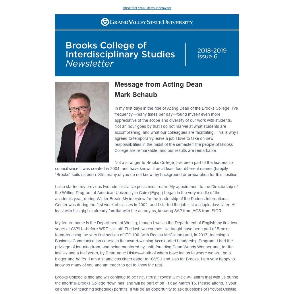 Mark SchaubIn my first days in the role of Acting Dean of the Brooks College, I’ve frequently—many times per day—found myself even more appreciative of the scope and diversity of our work with students. Not an hour goes by that I do not marvel at what students are accomplishing, and what our colleagues are facilitating. This is why I agreed to temporarily leave a job I love to take on new responsibilities in the midst of the semester: the people of Brooks College are remarkable, and our results are remarkable.