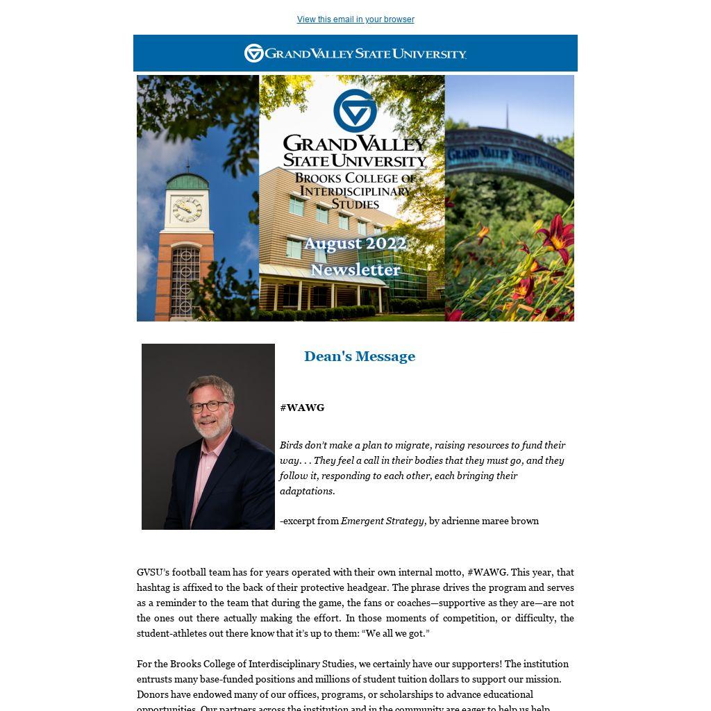 The Brooks College Fall 2022 Start-up Meeting is scheduled for Friday, August 19, 2022! The event will be held at Loosemore Auditorium & Hager-Lubbers Exhibition Hall in the Richard M. DeVos Center. Breakfast will be served from 8:00 - 8:30 am, and the program will follow from 9:00 - 11:30 am. We look forward to seeing you there to kick off a great year!