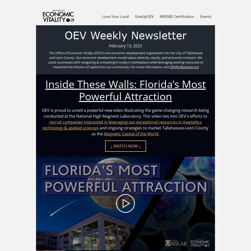 The Office of Economic Vitality (OEV) is the economic development organization for the City of Tallahassee and Leon County. Our economic development model values diversity, equity, and economic inclusion. We assist businesses with navigating & competing in today’s marketplace while leveraging existing resources to maximize the infusion of capital into our community. For more information, visit OEVforBusiness.org