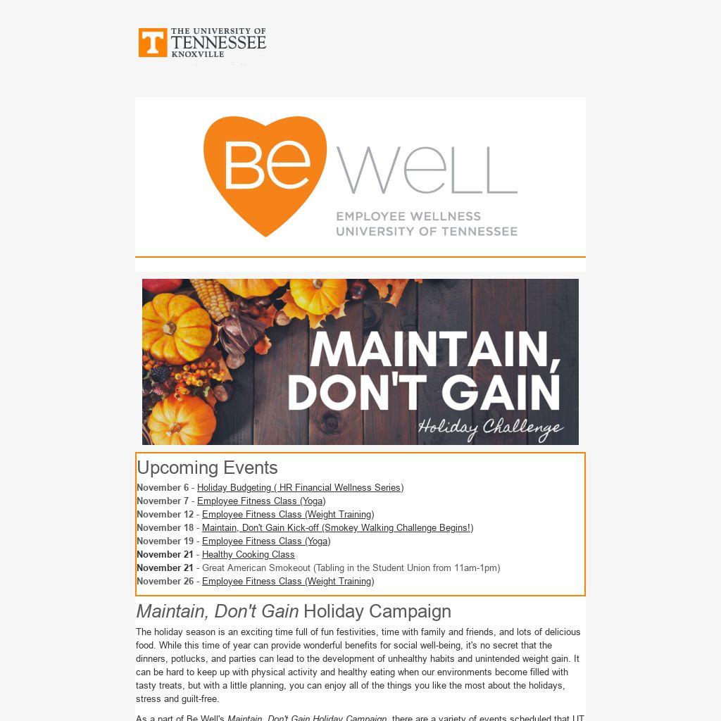 As a part of Be Well's Maintain, Don't Gain Holiday Campaign, there are a variety of events scheduled that UT faculty and staff can take advantage of while at work.