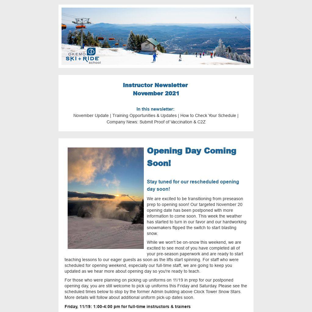While we won't be on-snow this weekend, we are excited to see most of you have completed all of your pre-season paperwork and are ready to start teaching lessons to our eager guests as soon as the lifts start spinning. For staff who were scheduled for opening weekend, especially our full-time staff, we are going to keep you updated as we hear more about opening day so you're ready to teach.