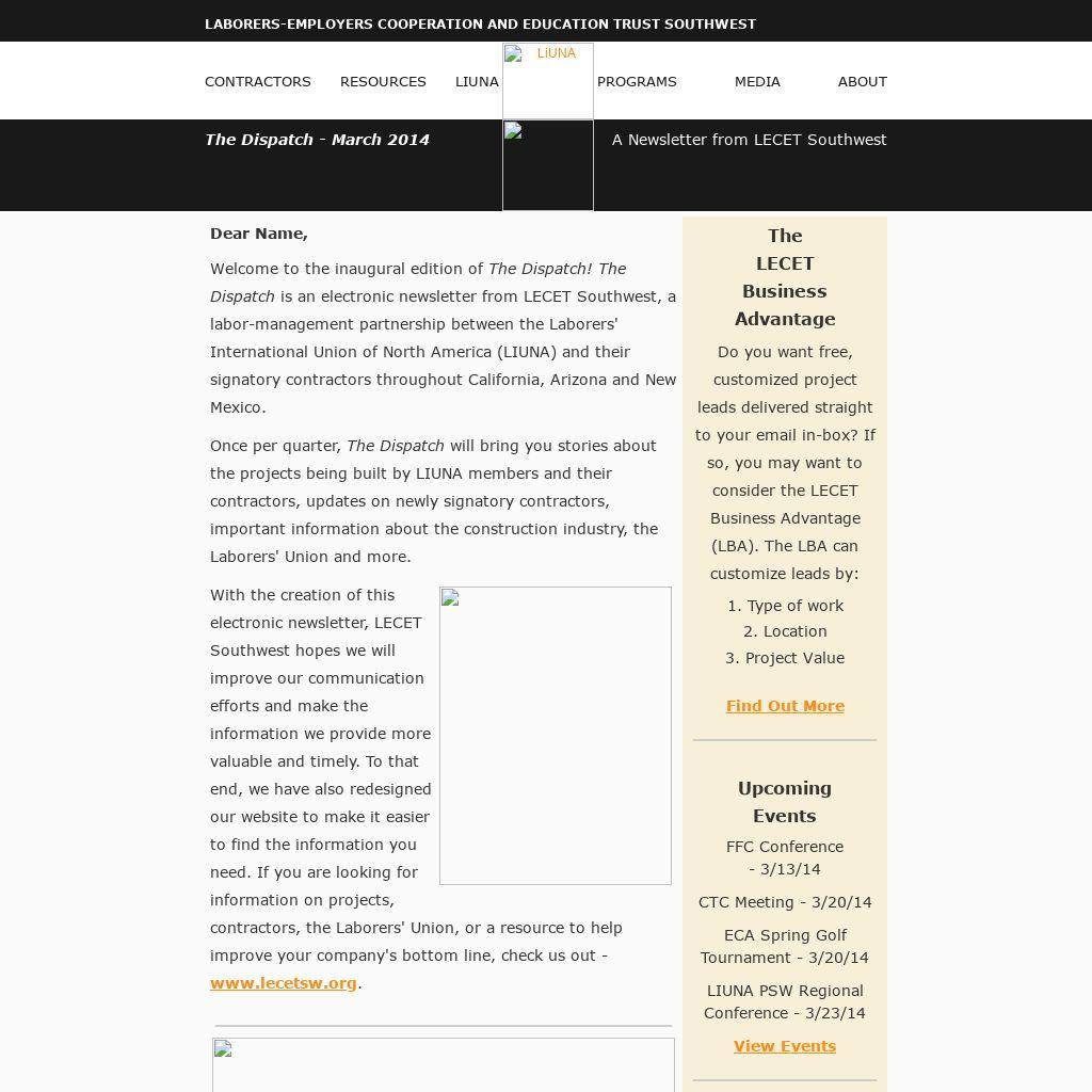 Welcome to the inaugural edition of The Dispatch! The Dispatch is an electronic newsletter from LECET Southwest, a labor-management partnership between the Laborers' International Union of North America (LIUNA) and their signatory contractors throughout California, Arizona and New Mexico.