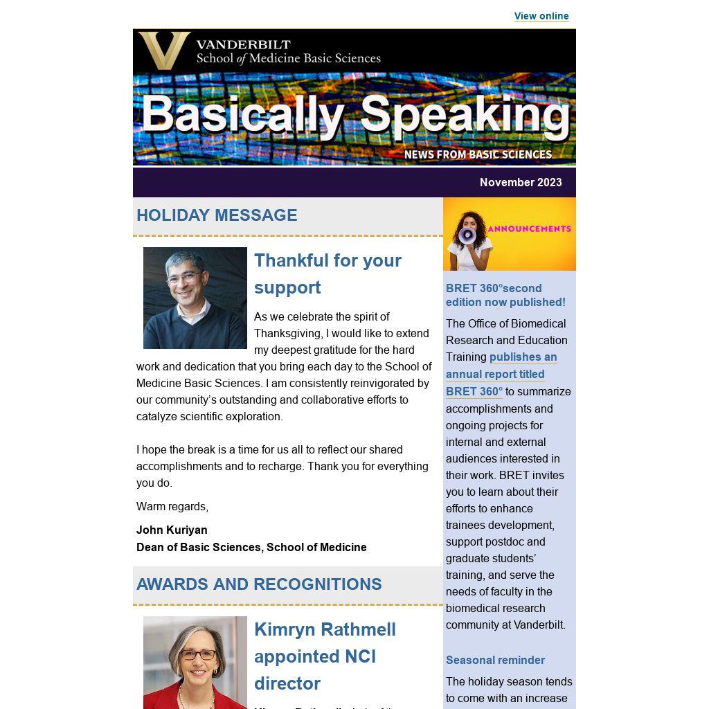 About the newsletterThis newsletter recognizes the achievements and latest discoveries of students, postdocs, faculty, and staff associated with Basic Sciences departments, centers, and cores or who carry out basic biomedical research at Vanderbilt.