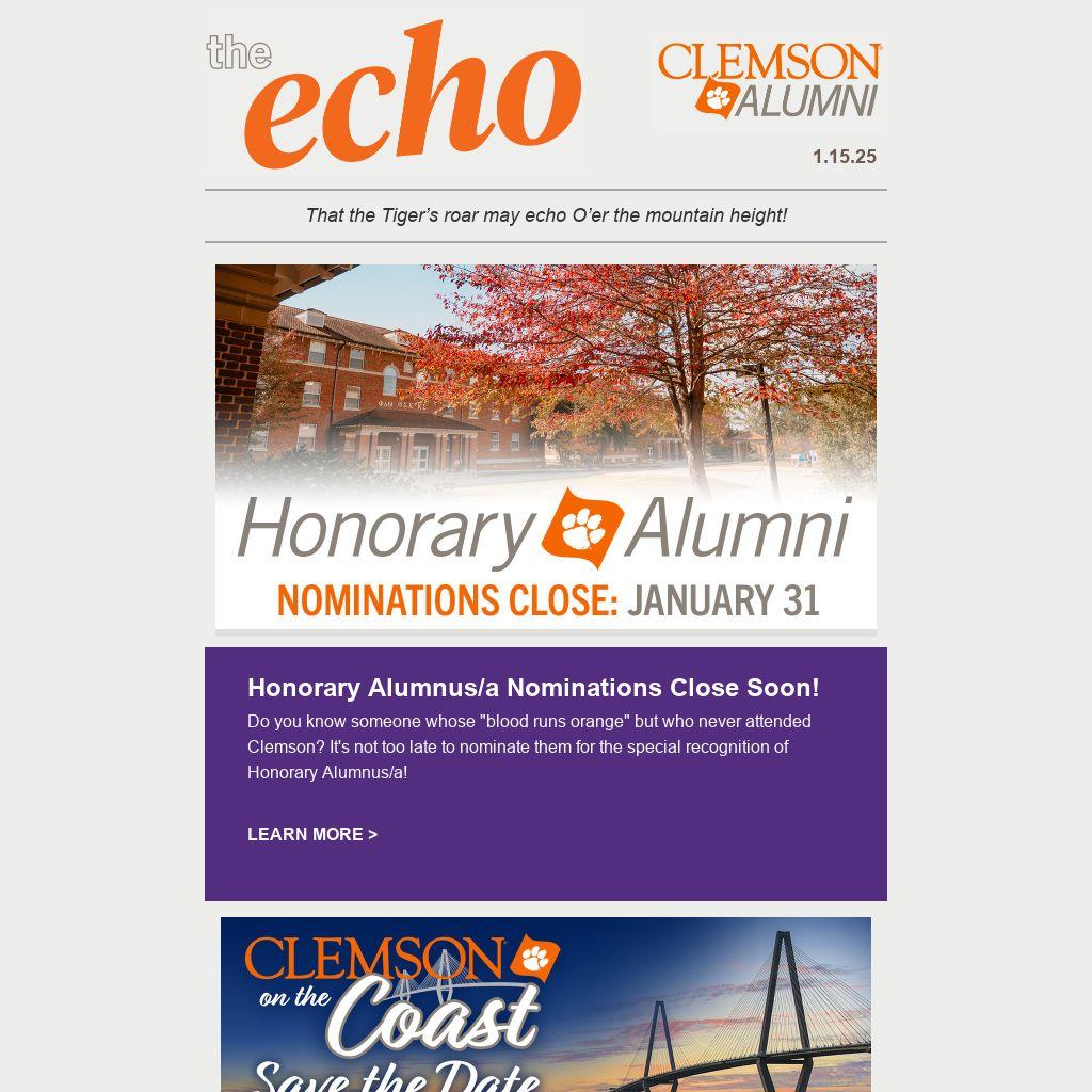 Honorary Alumnus/a Nominations Close Soon! Do you know someone whose "blood runs orange" but who never attended Clemson? It's not too late to nominate them for the special recognition of Honorary Alumnus/a!