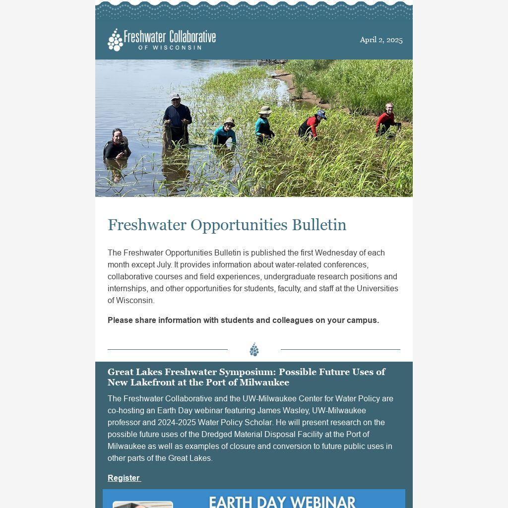 The Freshwater Opportunities Bulletin is published the first Wednesday of each month except July. It provides information about water-related conferences, collaborative courses and field experiences, undergraduate research positions and internships, and other opportunities for students, faculty, and staff at the Universities of Wisconsin.