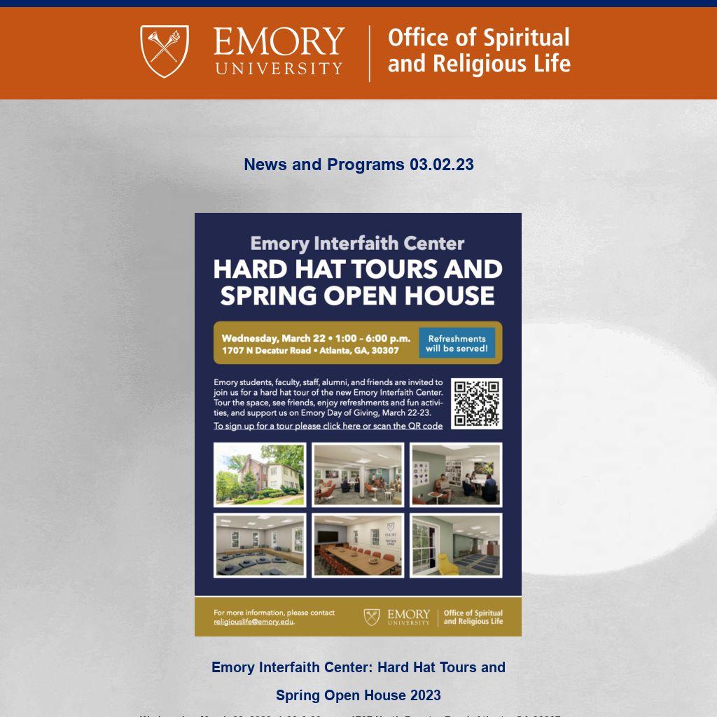 Emory OSRL ENews is published weekly during the term by the Emory University Office of Spiritual and Religious Life publicizing Atlanta-campus spiritual life programs. It is not a comprehensive listing. For Oxford College spiritual life, please click here. To submit information or to update your preferences, please contact religiouslife@emory.edu.