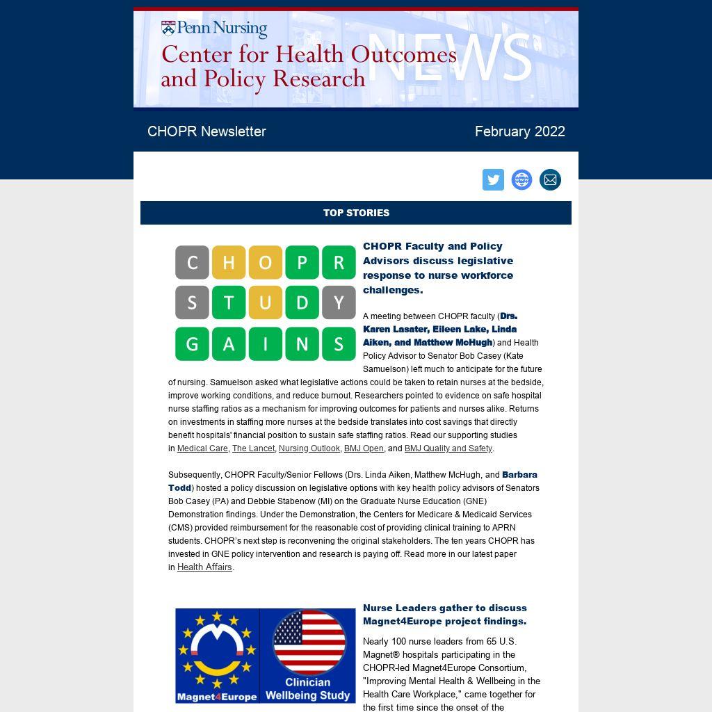The CHOPR Newsletter is published quarterly at the Center for Health Outcomes and Policy Research, University of Pennsylvania School of Nursing. Contact Andrea Barol with any questions or comments at ajb@nursing.upenn.edu.