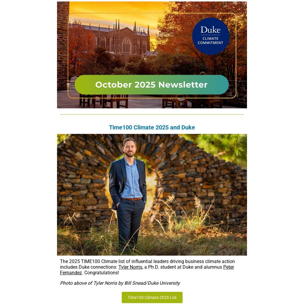 The 2025 TIME100 Climate list of influential leaders driving business climate action includes Duke connections: Tyler Norris, a Ph.D. student at Duke and alumnus Peter Fernandez. Congratulations!