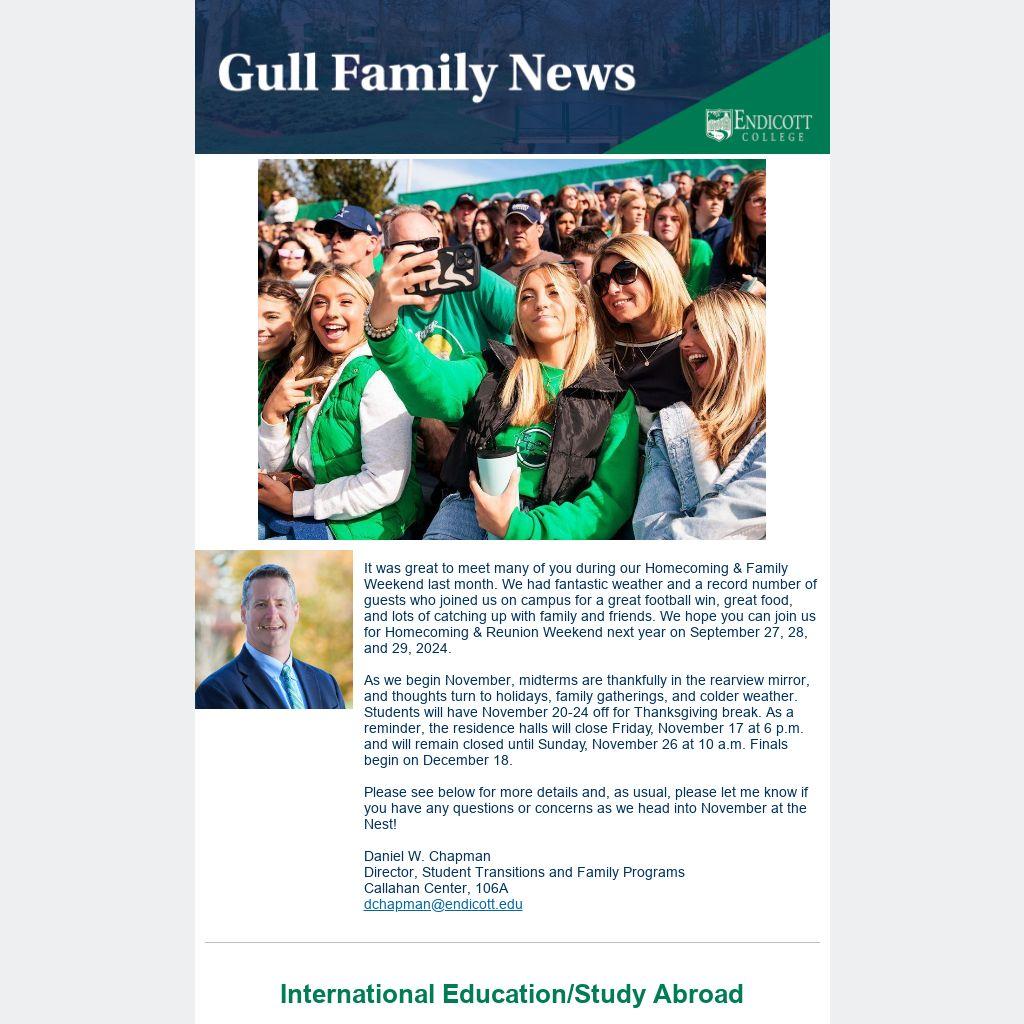Make sure your student keeps an eye out for the Campus Activities Board (CAB) Gullabration schedule! Gullabration is from November 29-December 13 and is full of holiday-themed events to get your students ready for the holidays and to give them some fun and relaxing things to do before finals! Students can follow @endicott_cab for more information on the events.