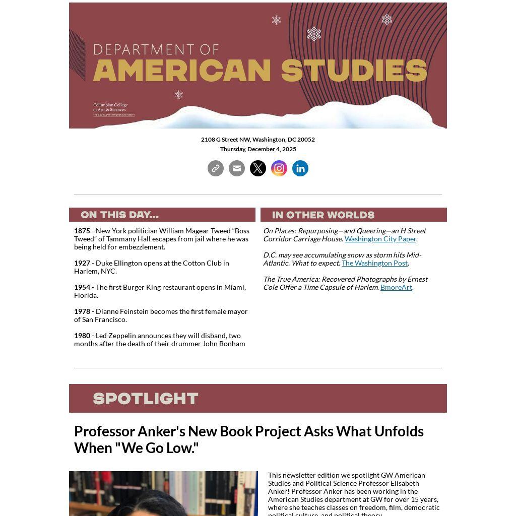 This newsletter edition we spotlight GW American Studies and Political Science Professor Elisabeth Anker! Professor Anker has been working in the American Studies department at GW for over 15 years, where she teaches classes on freedom, film, democratic political culture, and political theory.