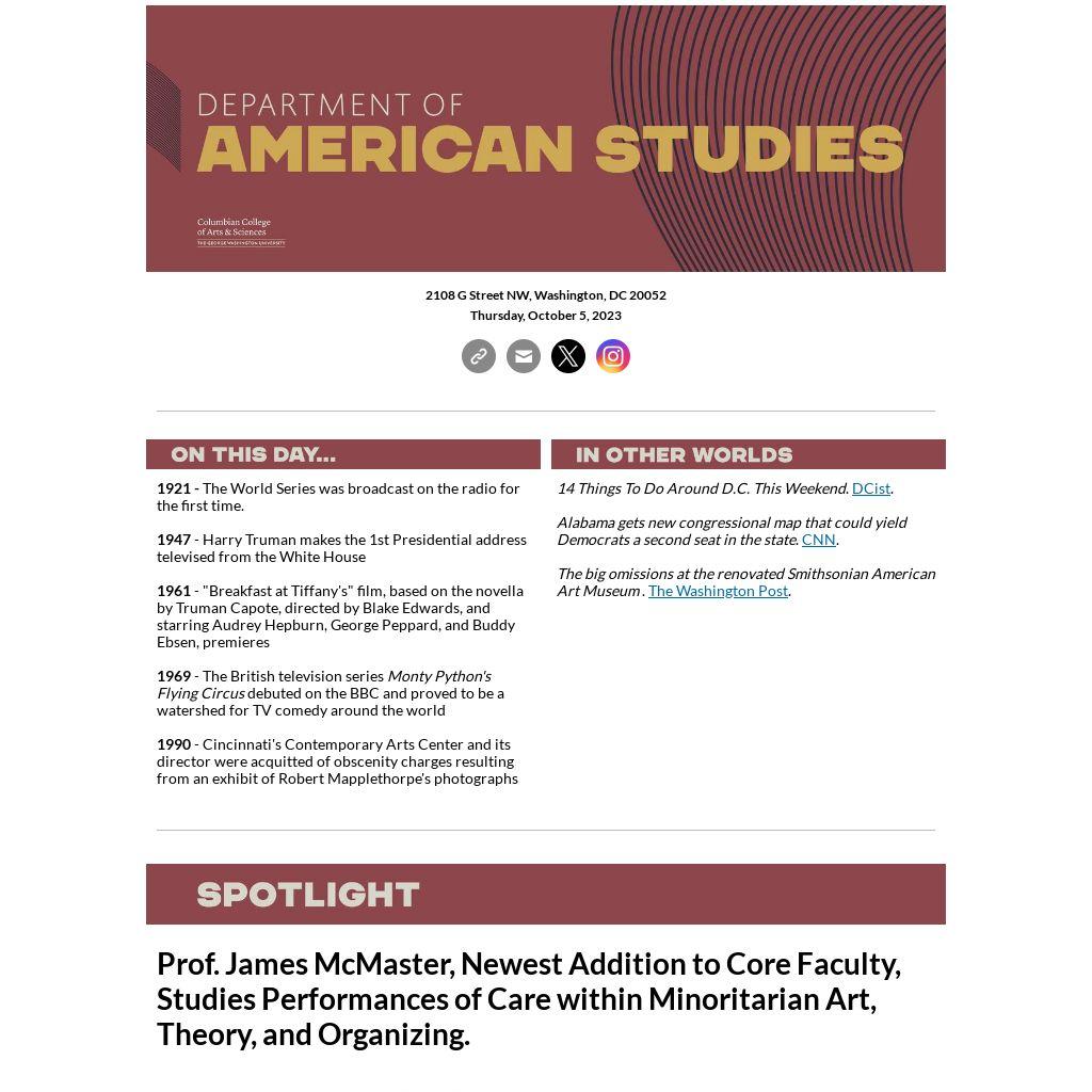 Like what you see? Have spotlights, kudos, events, or opportunities that you would like to share? We want to hear from you! Navigate to our feedback form using the link below, or more simply, forward your tip to amst@gwu.edu.