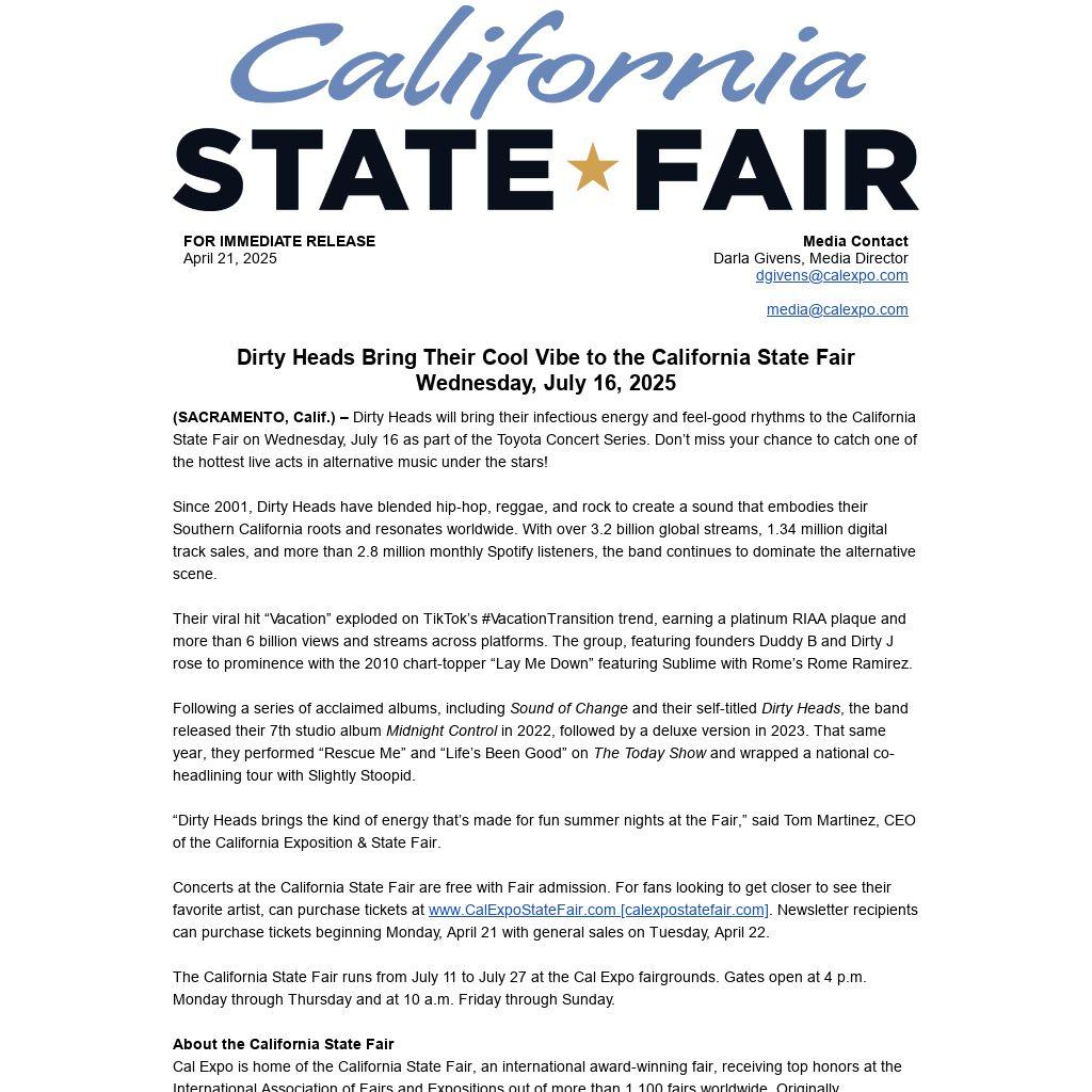 “Dirty Heads brings the kind of energy that’s made for fun summer nights at the Fair,” said Tom Martinez, CEO of the California Exposition & State Fair.