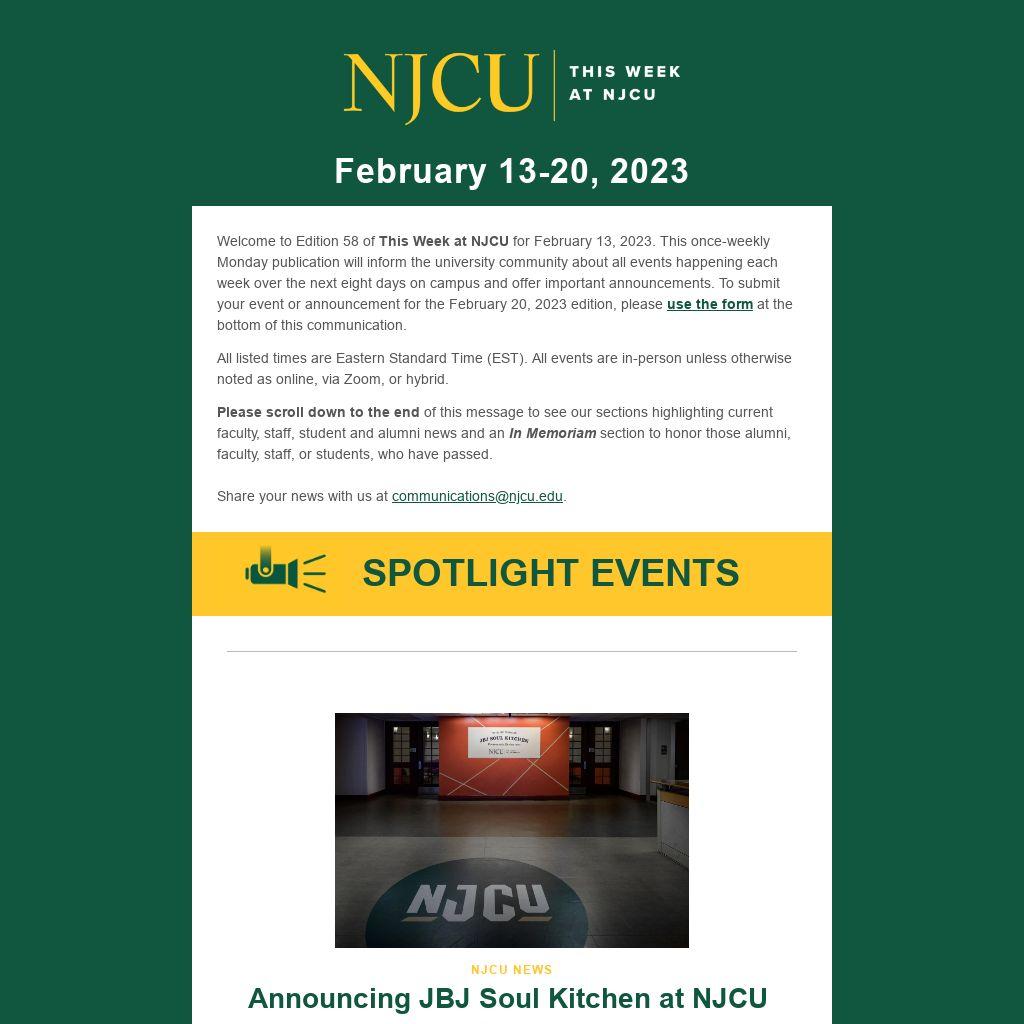Welcome to Edition 58 of This Week at NJCU for February 13, 2023. This once-weekly Monday publication will inform the university community about all events happening each week over the next eight days on campus and offer important announcements. To submit your event or announcement for the February 20, 2023 edition, please use the form at the bottom of this communication.