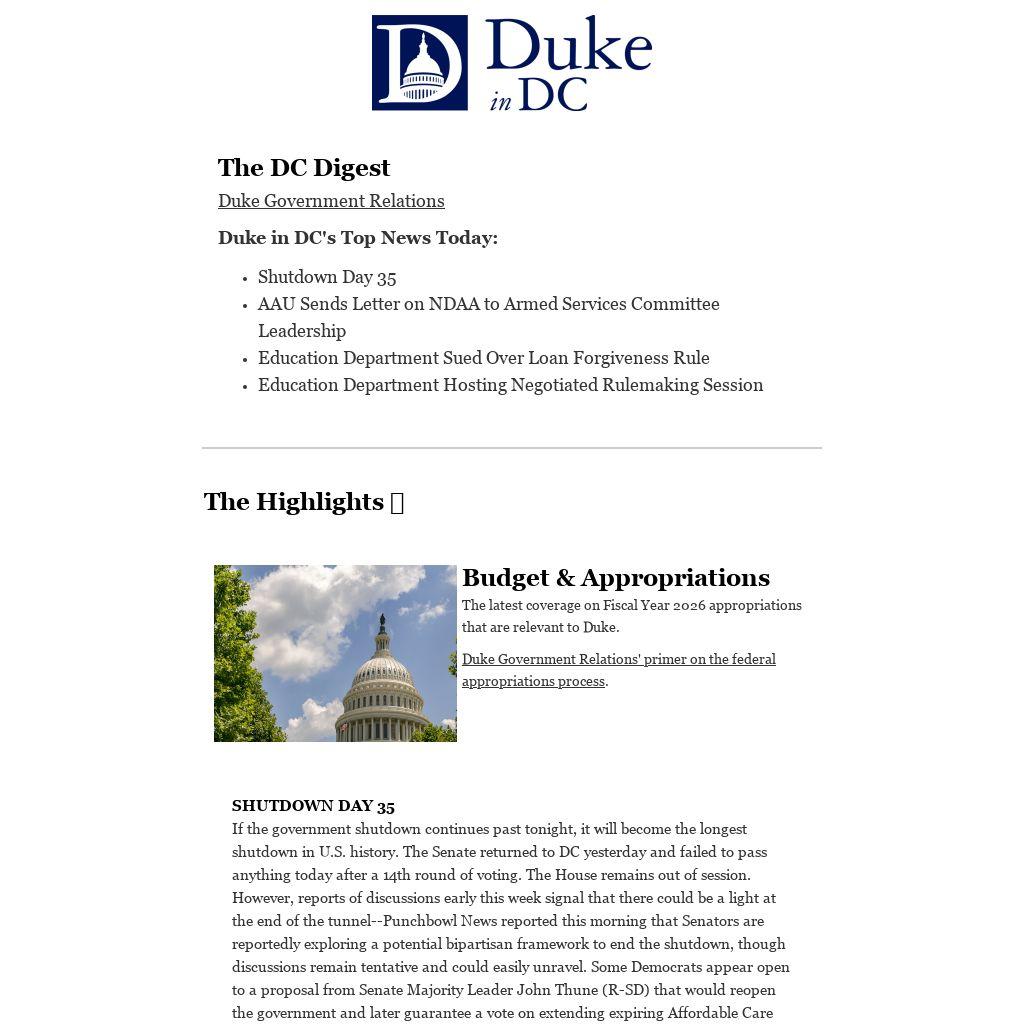 The Association of American Universities (AAU), of which Duke is a member, and the American Public and Land-Grant Universities (APLU) transmitted a joint letter to the Hill this week outlining shared conference priorities for the final FY26 National Defense Authorization Act (NDAA). They endorsed provisions extending existing research security policies, expanding classified research infrastructure at universities and maintaining fair reimbursement for research costs. However, the associations opposed measures they deemed unworkable or duplicative, including post-employment restrictions for researchers, overly broad prohibitions on foreign contracts and a provision tying federal funding to campus responses to antisemitic demonstrations. The letter urged negotiators to "continue to enact policies that support and protect university-based research and reject those that would undermine the United States’ ability to out-innovate strategic competitors."