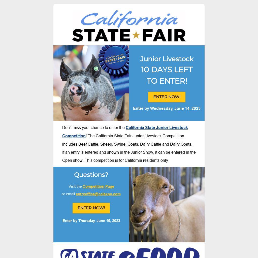 Don't miss your chance to enter the California State Junior Livestock Competition! The California State Fair Junior Livestock Competition includes Beef Cattle, Sheep, Swine, Goats, Dairy Cattle and Dairy Goats. If an entry is entered and shown in the Junior Show, it can be entered in the Open show. This competition is for California residents only.