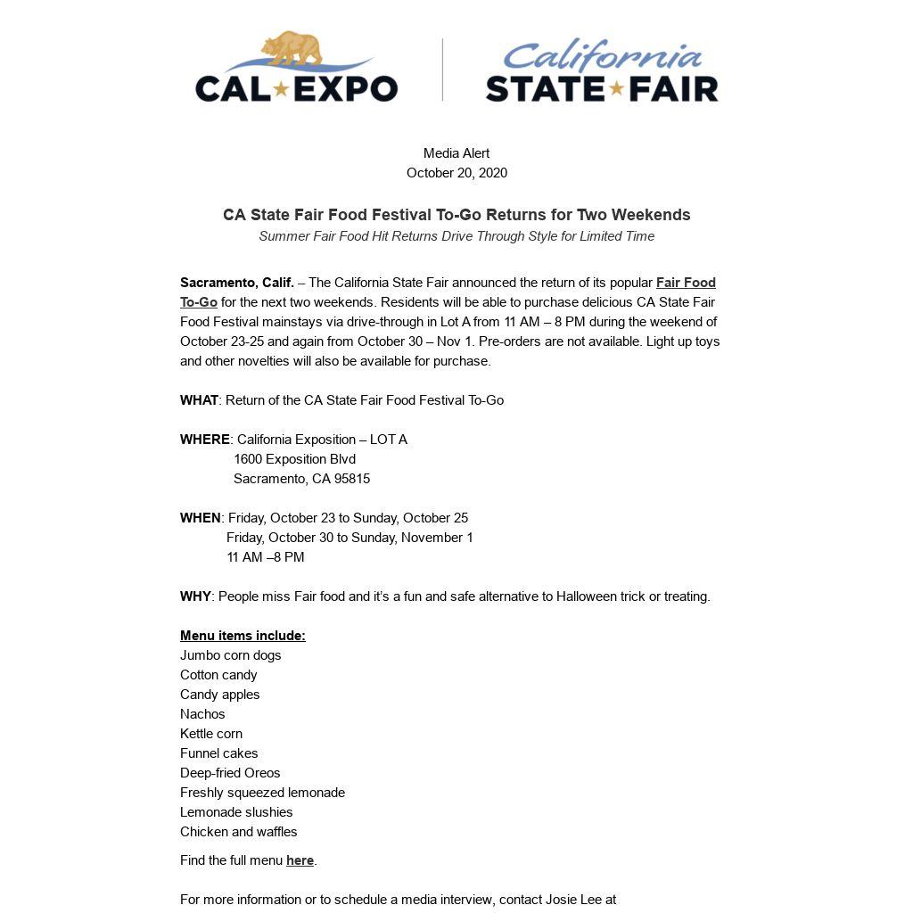 CA State Fair Food Festival To-Go Returns for Two Weekends Summer Fair Food Hit Returns Drive Through Style for Limited Time