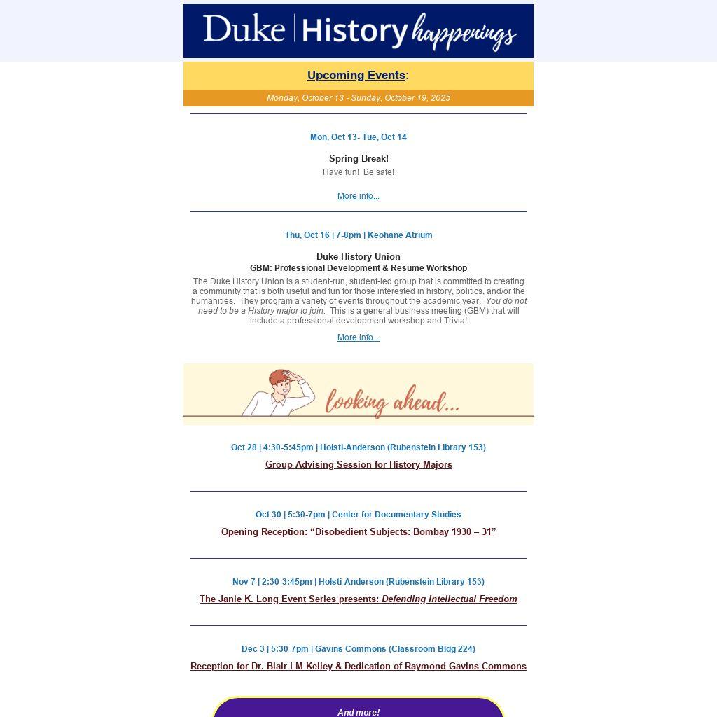 Events listed are primarily sponsored or co-sponsored by the Department of History at Duke University, or connected in some fashion to one or more of our faculty members. Please send submissions and comments to history@duke.edu. If you did not receive this message directly and wish to subscribe to this weekly email, click here. We are located in Classroom Building on Duke's East Campus: 1356 Campus Drive, Durham, NC 27708. Or visit us online at history.duke.edu.