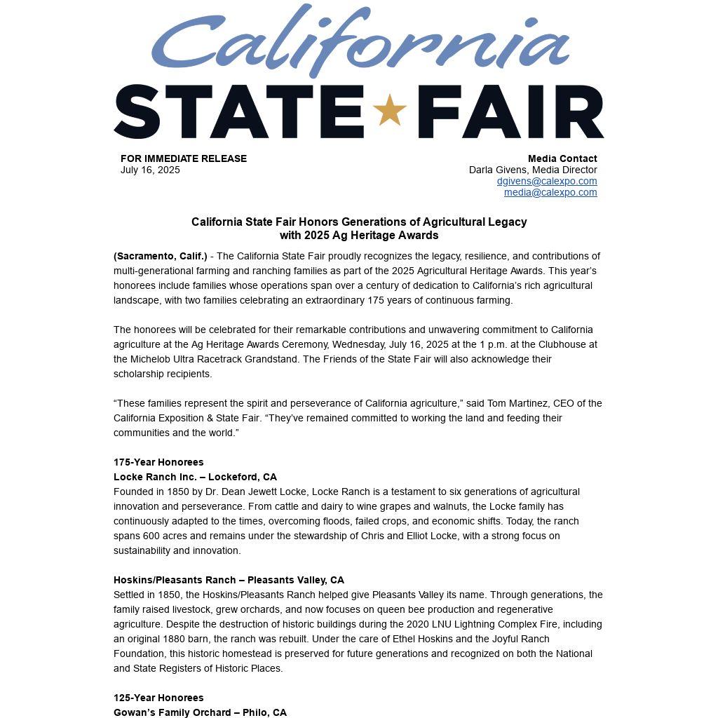 (Sacramento, Calif.) - The California State Fair proudly recognizes the legacy, resilience, and contributions of multi-generational farming and ranching families as part of the 2025 Agricultural Heritage Awards. This year’s honorees include families whose operations span over a century of dedication to California’s rich agricultural landscape, with two families celebrating an extraordinary 175 years of continuous farming.