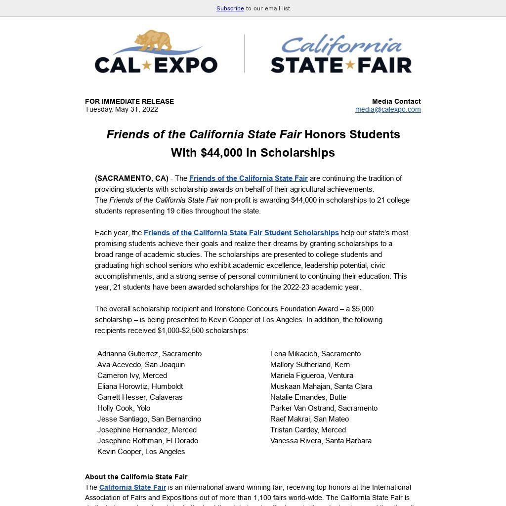 (SACRAMENTO, CA) - The Friends of the California State Fair are continuing the tradition of providing students with scholarship awards on behalf of their agricultural achievements. The Friends of the California State Fair non-profit is awarding $44,000 in scholarships to 21 college students representing 19 cities throughout the state.