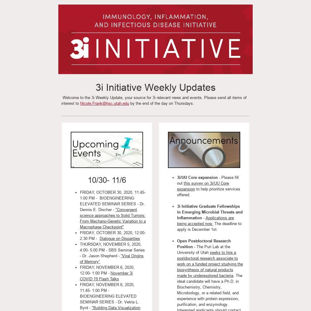 Welcome to the 3i Weekly Update, your source for 3i relevant news and events. Please send all items of interest to Nicole.Frank@hsc.utah.edu by the end of the day on Thursdays.