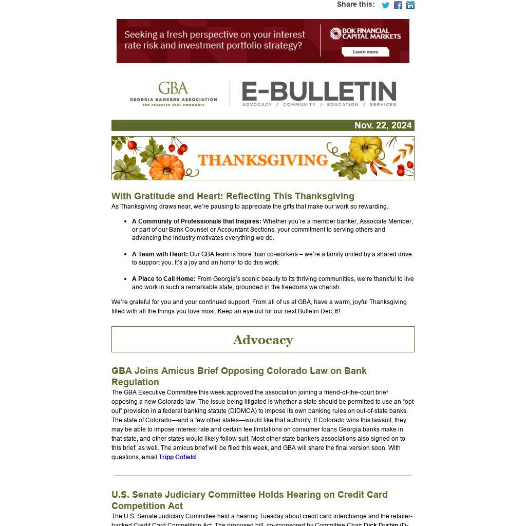 GBA Joins Amicus Brief Opposing Colorado Law on Bank RegulationThe GBA Executive Committee this week approved the association joining a friend-of-the-court brief opposing a new Colorado law. The issue being litigated is whether a state should be permitted to use an “opt out” provision in a federal banking statute (DIDMCA) to impose its own banking rules on out-of-state banks. The state of Colorado—and a few other states—would like that authority. If Colorado wins this lawsuit, they may be able to impose interest rate and certain fee limitations on consumer loans Georgia banks make in that state, and other states would likely follow suit. Most other state bankers associations also signed on to this brief, as well. The amicus brief will be filed this week, and GBA will share the final version soon. With questions, email Tripp Cofield.