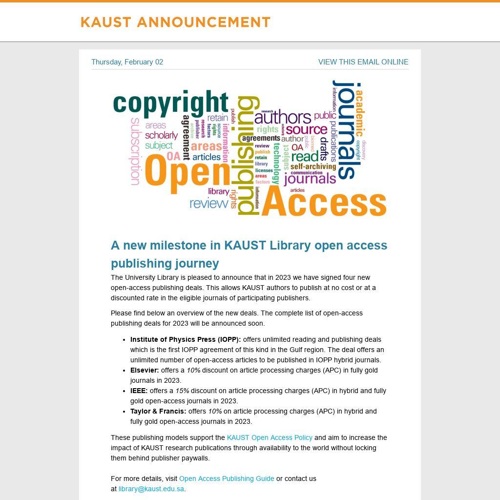 The University Library is pleased to announce that in 2023 we have signed four new open-access publishing deals. This allows KAUST authors to publish at no cost or at a discounted rate in the eligible journals of participating publishers.
