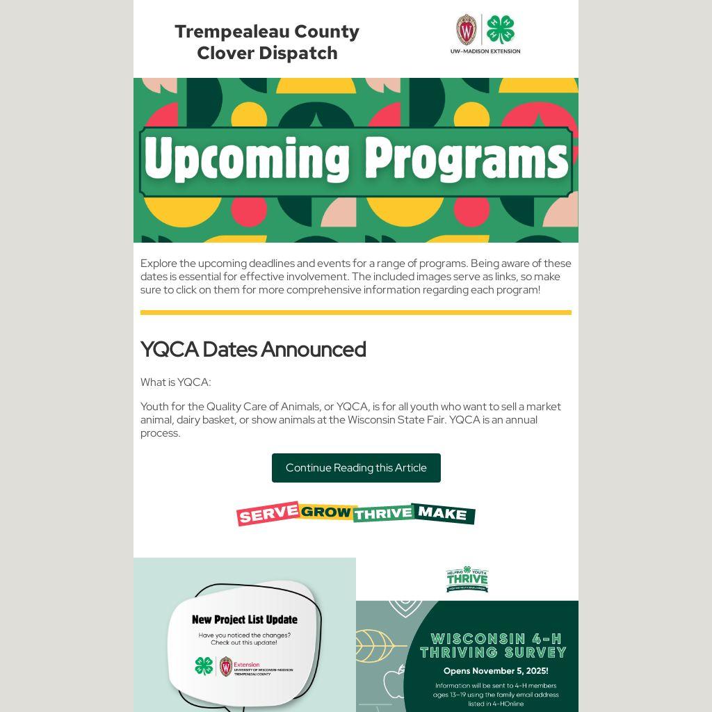 We have a new and updated calendar on our website! Check there for more information on upcoming programs and registration dates. I would love to add current club meeting times and other 4-H events to this calendar. Please email Andrea to add anything to the calendar.
