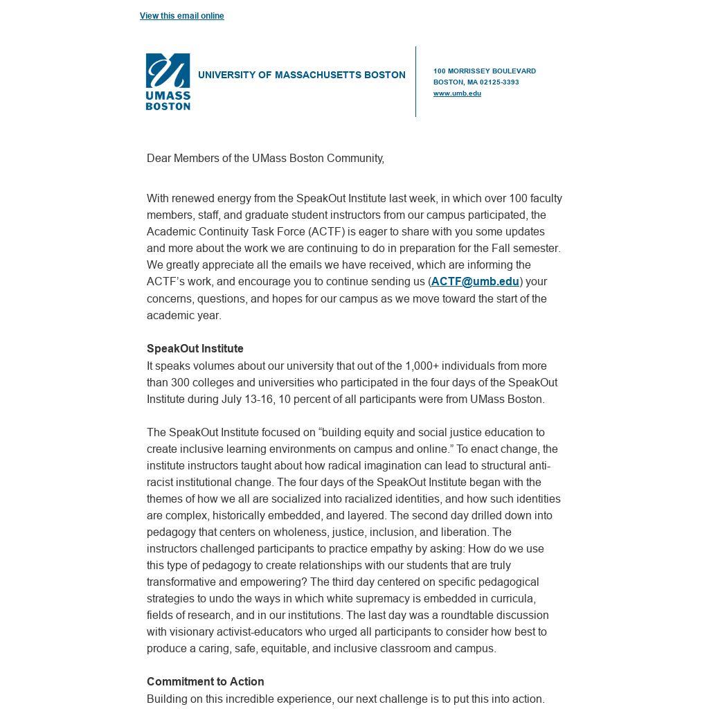 With renewed energy from the SpeakOut Institute last week, in which over 100 faculty members, staff, and graduate student instructors from our campus participated, the Academic Continuity Task Force (ACTF) is eager to share with you some updates and more about the work we are continuing to do in preparation for the Fall semester. We greatly appreciate all the emails we have received, which are informing the ACTF’s work, and encourage you to continue sending us (ACTF@umb.edu) your concerns, questions, and hopes for our campus as we move toward the start of the academic year.