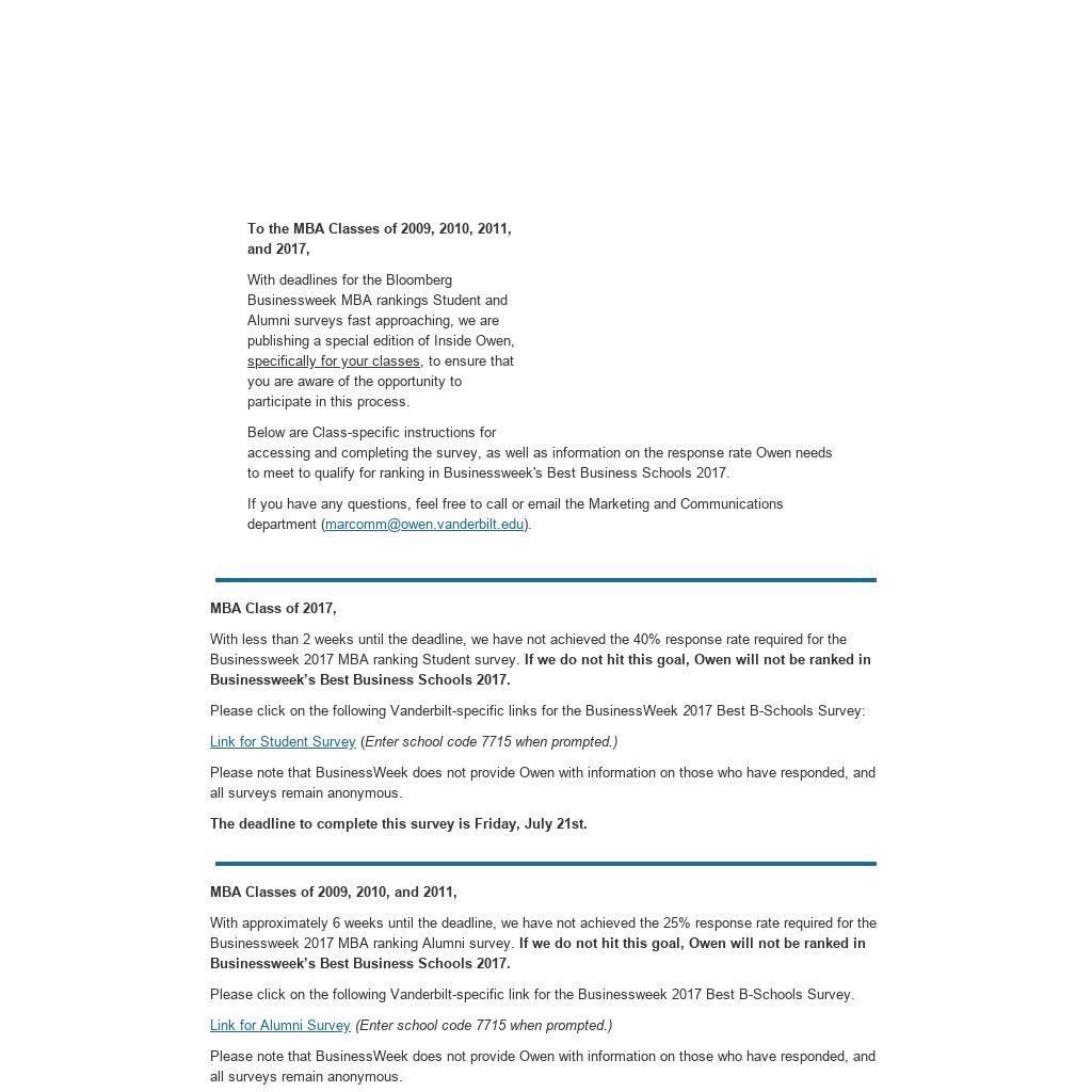 With approximately 6 weeks until the deadline, we have not achieved the 25% response rate required for the Businessweek 2017 MBA ranking Alumni survey. If we do not hit this goal, Owen will not be ranked in Businessweek’s Best Business Schools 2017.