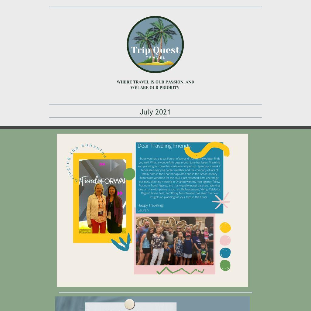I am Lauren Williams, owner of Trip Quest Travel Services for the past six years. Moving from three decades in education to becoming a travel consultant has caused me to shift from “The Doctor of Education” to “The Doctor of Travel.” My clients are often just like me – they want a rejuvenating vacation that teaches them about the world and the cultures around them. I love beautiful scenery, exploring new places, and learning something new every day! Aside from travel, I stay busy with my husband, Steve, and our four children and thirteen grandchildren. Being active in the church and in our community feeds our souls as well. I love to play tennis, pickleball, and bridge when I am not helping clients plan that perfect trip! Because our world is so much smaller now, I am happy to work with clients wherever they might live…but by referral only. Hope you enjoy my monthly newsletter – let me know if there is something you’d like to know more about!